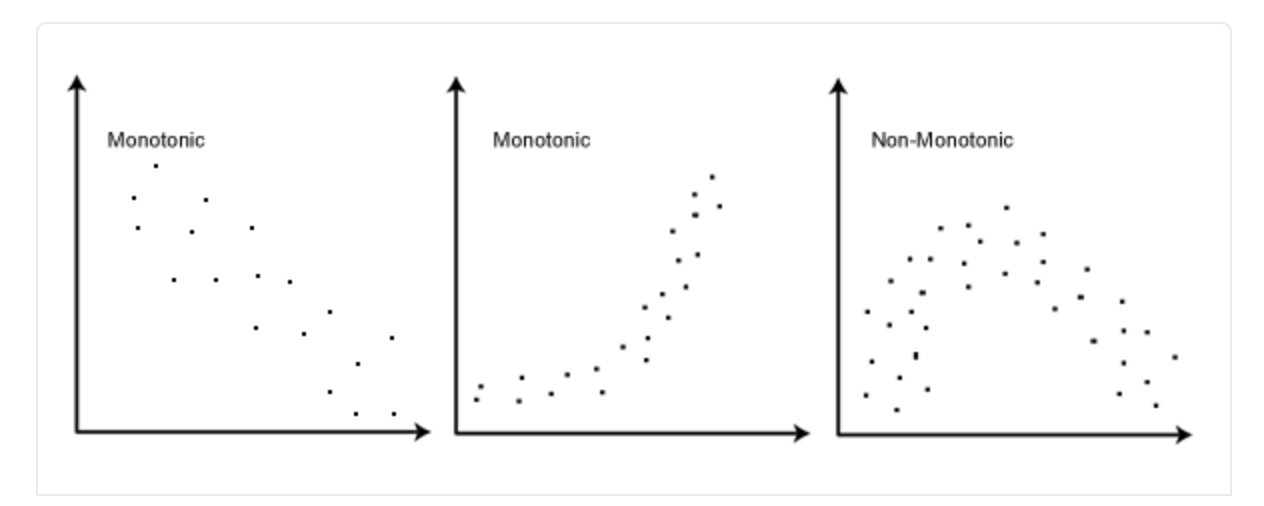 Spearman’s coefficient also does not stipulate that the two variables must be linearly correlated - rather, they must have a monotonic relationship, meaning that when one variable increases, so does the other (not necessarily in a linear fashion.)2 This picture is all you need to understand monotonicity: